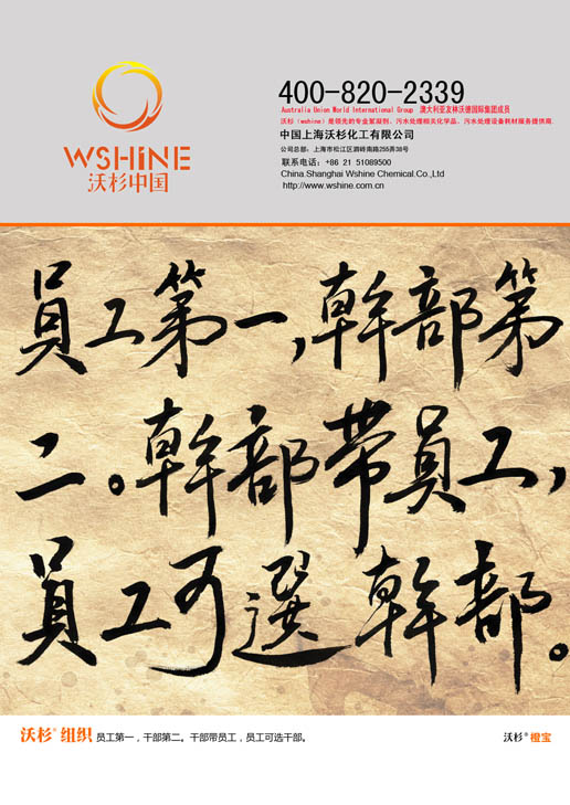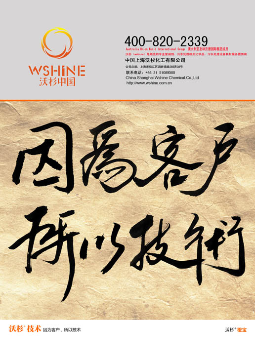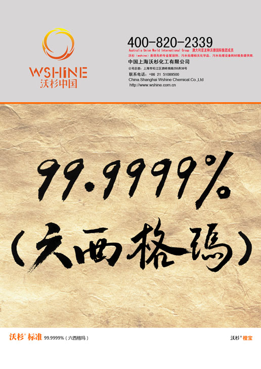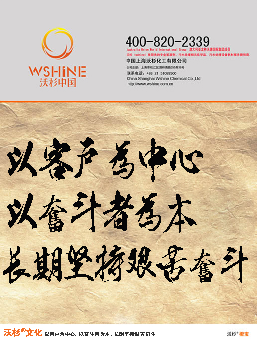 沃杉®是著名絮凝剂和拥有22年水处理专业经验的高新技术公司,连续15年被认定为上海高新技术企业。沃杉 ® 2002 年筹备,2004 年正式注册于中国上海;沃杉 ® 立足于水溶性高分子聚合物的应用和开发,目标是成为世界水处理化学品的顶级品牌,做全球更受欢迎和钦佩的公司之一;沃杉 ® 发展布局目标全球 5 大洲,始终努力帮助客户更快获取成功是沃杉存在的理由;沃杉 ® 不满足于今天取得的任何业绩和成就,不畏惧客户提出的任何难题;沃杉 ® 对人才的尊重和对研发的重视是对客户服务的有力保证;沃杉 ® 与众多行业专家在不同区域和国家展开合作,时刻关注为您所在行业和区域提供更佳解决方案。沃杉®一直致力于帮助我们的客户取得成功,其中很多均在世界知名企业之列。我们努力帮助我们的客户发现具有独特价值的解决方案,因而被誉为真正的商业伙伴。这意味着沃杉®值得信赖、有创造性并具有进取心;这意味着沃杉®立保事情不出差错并在的确出错时能承担责任;这更意味着沃杉®在运作中恪守商业道德……
